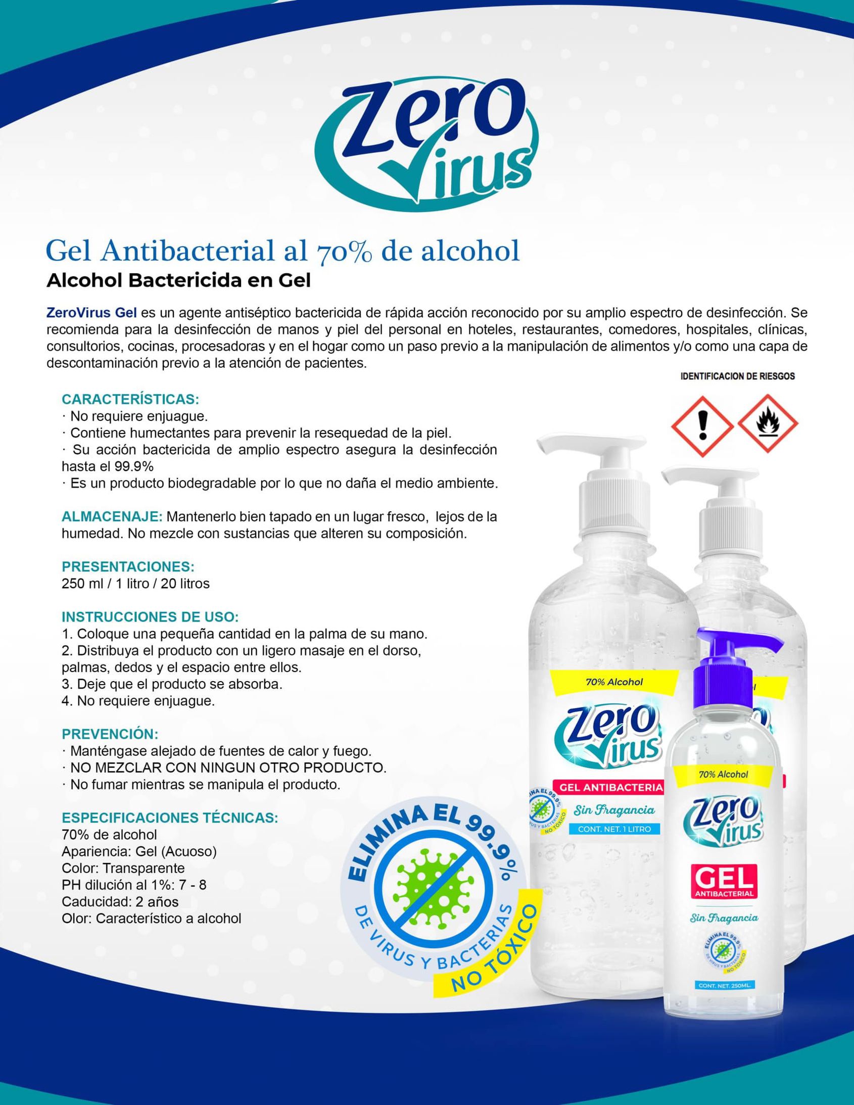 Zero Virus Gel es un agente antiséptico bactericida de rápida acción reconocido por su amplio espectro de desinfección. Se recomienda para la desinfección de manos y piel del personal en hoteles, restaurantes, comedores, hospitales, clínicas, consultorios, cocinas, procesadoras y en el hogar como un paso previo a la manipulación de alimentos y/o como una capa de descontaminación previo a la atención de pacientes.